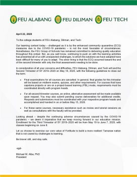 In consideration of all your concerns and difficulties, FEU Alabang, Diliman, and Tech will end the Second Trimester of SY 2019?2020 on May 18, 2020, with the following guidelines to close out the term: